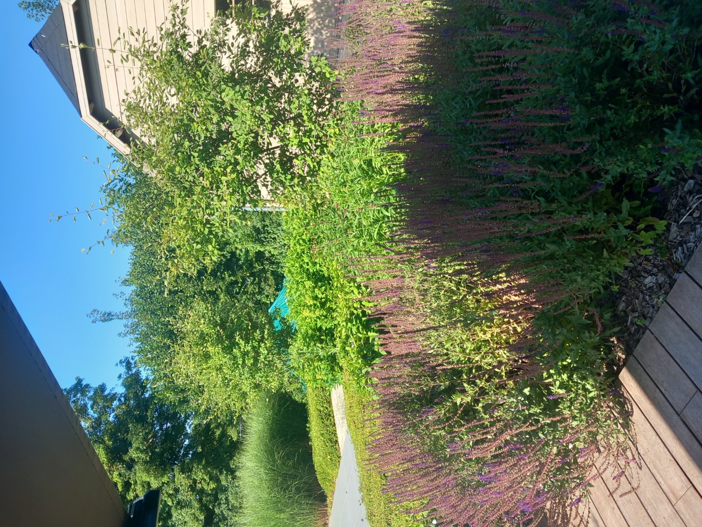 L'ambiance végétale a été radicalement transformée pour devenir un jardin propice aux papillons et aux abeilles. La sélection florale privilégie les essences mellifères, créant un écosystème vibrant de vie. Pour donner du relief et de la hauteur, des arbres multi-troncs ont été plantés stratégiquement. Leur silhouette sculpturale assure une structure visuelle forte, même en hiver, tout en apportant une ombre légère et tamisée sur les espaces de repos.
